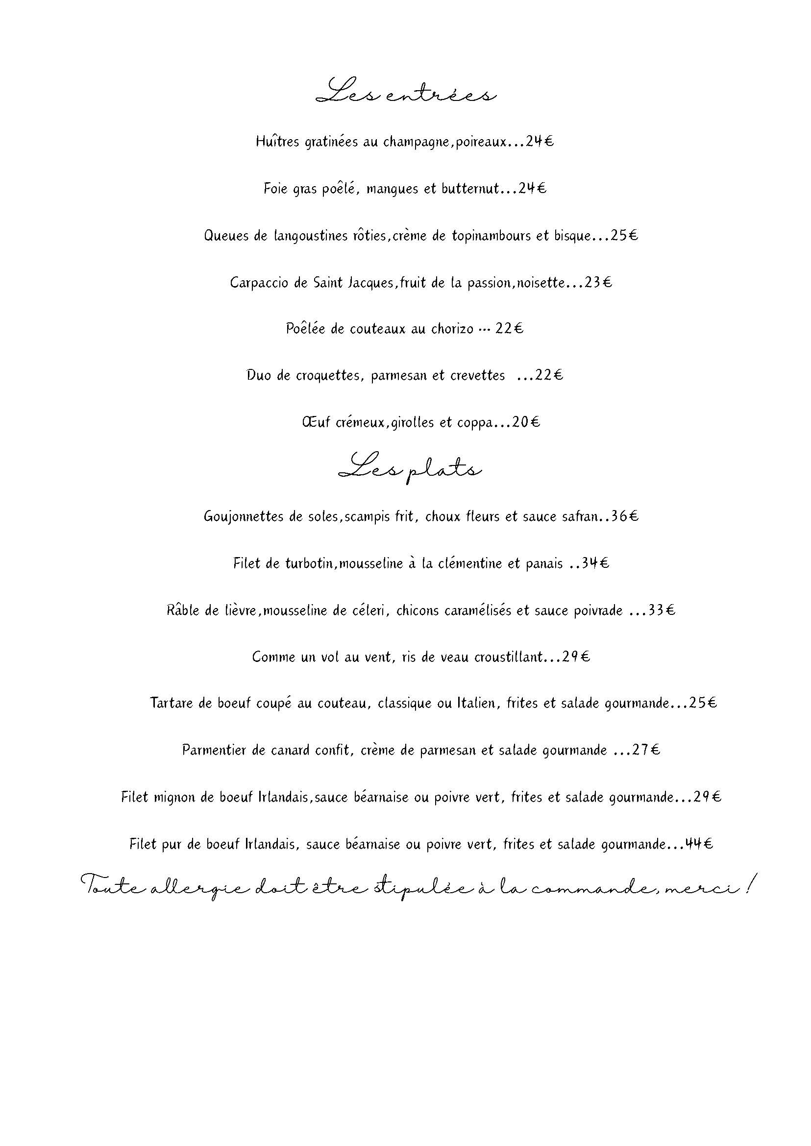 Notre philosophie est de cuisiner les produits du moment. Notre carte évolue chaque semaine en fonction du marché. Entrée , plat en fonction du marché 30 € Uniquement le Plat 20 € Ouvert de 12h à 13h30 et de 19h à 21h Réservations par téléphone (010) 45 35 85 ou via la page Réservations info@tilleuls.be Inscrivez-vous à notre newsletter pour être informé de nos changements de menu et de notre actualité.Resto